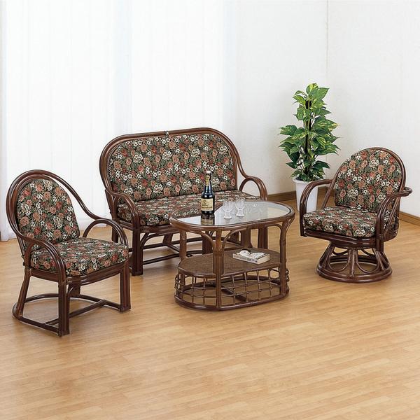 籐 アームチェア・回転座椅子・ソファ・テーブル リビング4点セット ( ラタン家具 リビングテーブルセット チェア ソファ 完成品 籐家具 ラブソファー センターテーブル ラブチェア 椅子 アジアン クッション付き )
