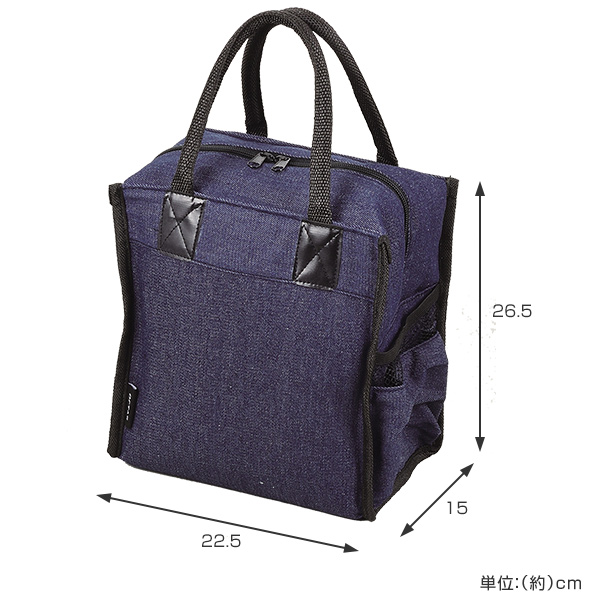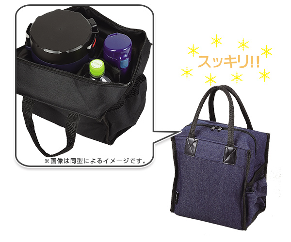 マチが広く安定感があって大容量のバッグランチジャーもペットボトルもステンレスボトルも全部入れてスッキリ持ち運ぶことが出来ます。ファスナー仕様なので中身が見えず、外ポケットもついているのでさっと物を出し入れできて便利です。デニム素材なので年齢を問わず使えます。