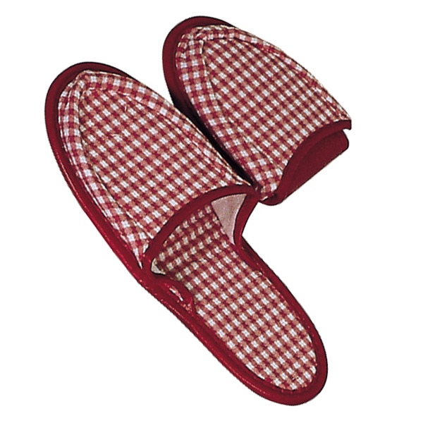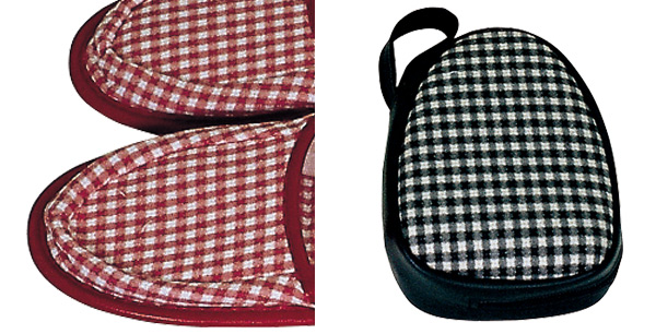 オニギリ型ケース入りの二つ折りスリッパです。明るい色合いのチェック柄で、幅広い年齢層で利用できます。