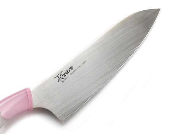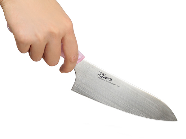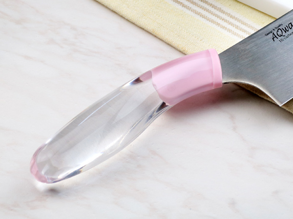 ハンドルに透明なアクリル樹脂を使用し、おしゃれでキレイなデザインの包丁です。太めのハンドルで、手に沿るようカーブがかかり、握りやすくなっています。刃部より柄部のほうが高い「ヒップアップハンドル」の形状で、力がかかりやすく、女性でも楽に押し切りが可能です。