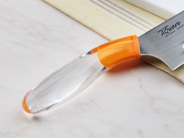 ハンドルに透明なアクリル樹脂を使用し、おしゃれでキレイなデザインの包丁です。太めのハンドルで、手に沿るようカーブがかかり、握りやすくなっています。刃部より柄部のほうが高い「ヒップアップハンドル」の形状で、力がかかりやすく、女性でも楽に押し切りが可能です。