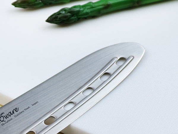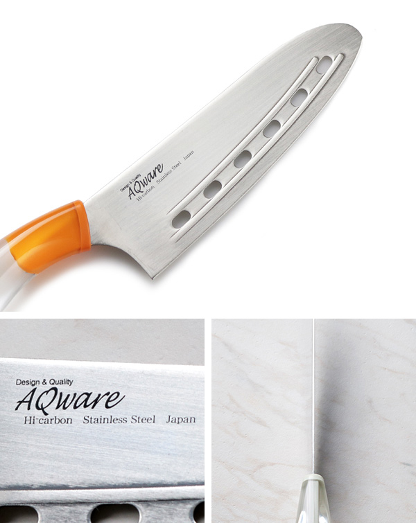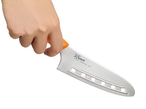●ハンドルに透明なアクリル樹脂を使用し、おしゃれでキレイなデザインのリブ付き穴あき三徳包丁、先丸タイプです。