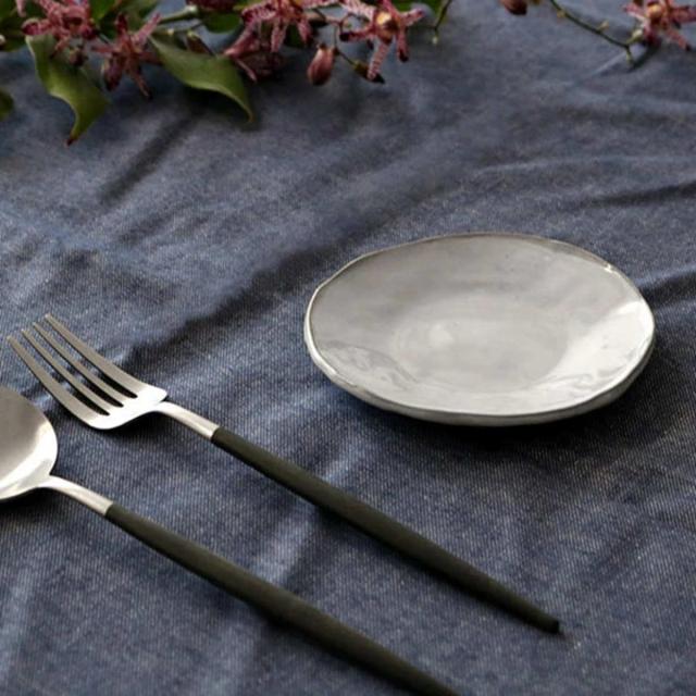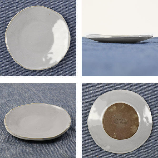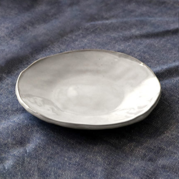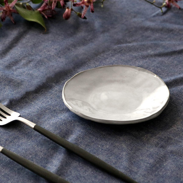 チョコレートやクッキーなどの小さなお菓子、箸休め用の豆皿としても使っていただけるサイズのプレートです。均一ではないリム(ふち)が食卓のアクセントとなり、優しいペールグレーの色味がお料理や野菜の色をより一層引き立てます。