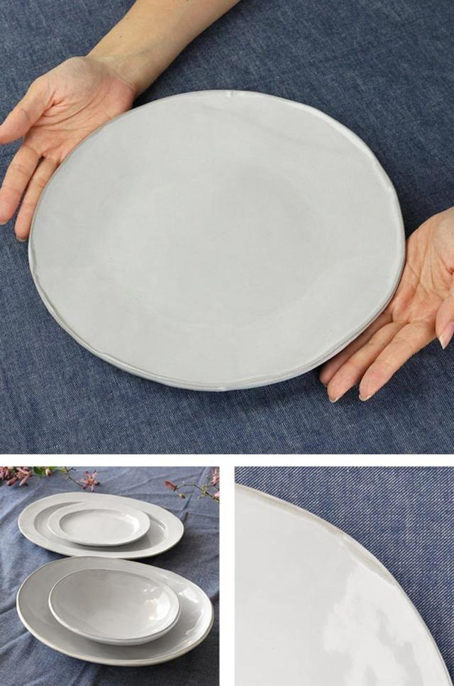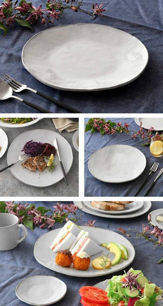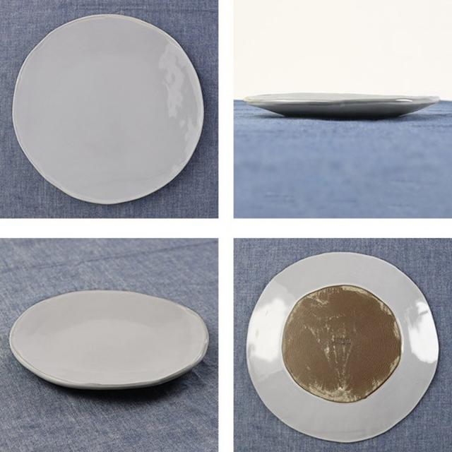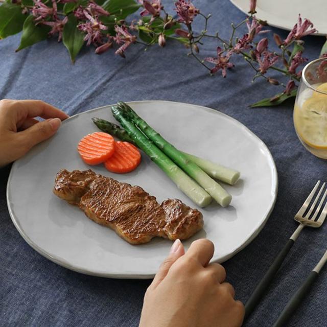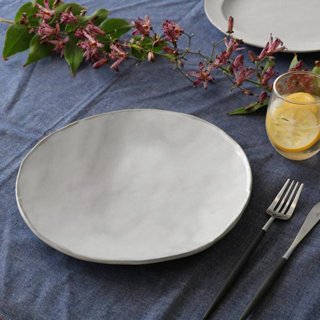 メイン料理やパスタ、ワンプレートランチなど幅広く使っていただけるサイズのプレートです。均一ではないリム(ふち)が食卓のアクセントとなり、優しいペールグレーの色味がお料理や野菜の色をより一層引き立てます。