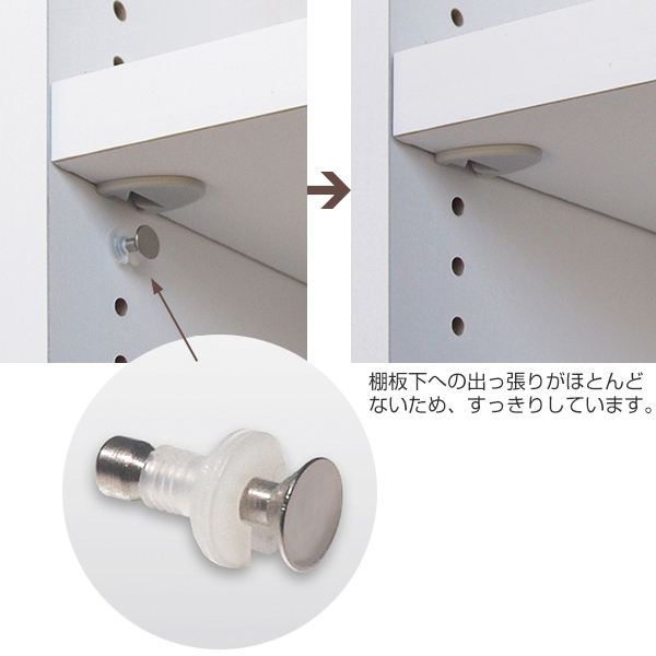 工具不要の簡単取り付けです。ダボの出っ張りがほとんどなく、棚板下ぎりぎりまで収納できるため収納効率がアップします。