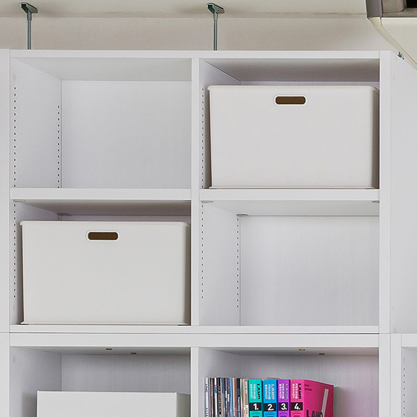 棚板は全て可動式です。収納物に合わせて1.5cmピッチで設置できるため、無駄なスペースをなくして収納できます。本体ご購入後、いつでも追加購入可能です。