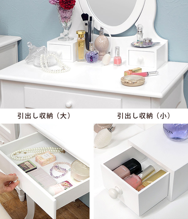 コンパクトだけど収納スペース&作業スペースもきちんとあるので毎日メイクをするのが楽しみになるようなドレッサーです。高さ4.5cmまでの物を収納できるメインの引き出しに、ちょっとした小物を収納できる可愛い引き出し付き。
