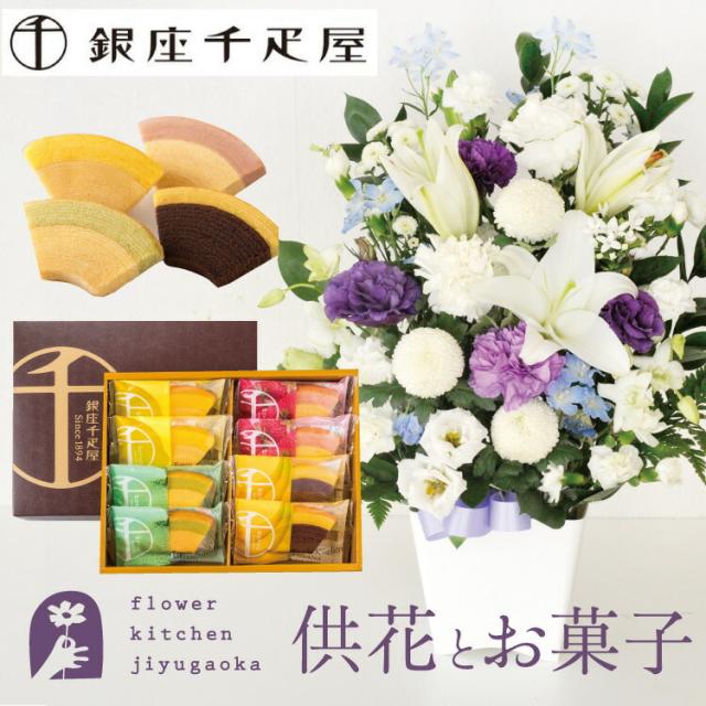 お供え花とスイーツのセット 洋花を使った旬のおまかせ お供え花 Lサイズ + 【銀座千疋屋】 銀座フルーツクーヘン8個入りセット 即日発送 喪中見舞い お悔み メッセージカード FKAA