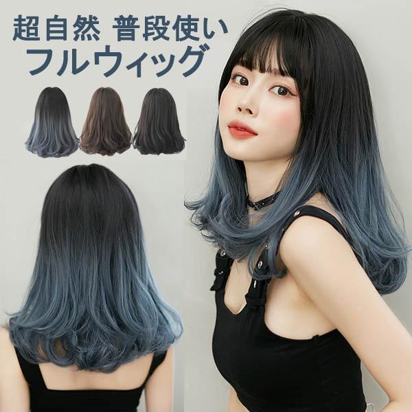 ウィッグ ミディアム 黒髪 レディース フルウィッグ スモーキーブルー セミロング かわいい 超自然 普段使い 透けバング シースルーバング エクステ グラデーション かつら wig ロング コスプレ ハロウィン レイヤー 小顔効果抜群 原宿