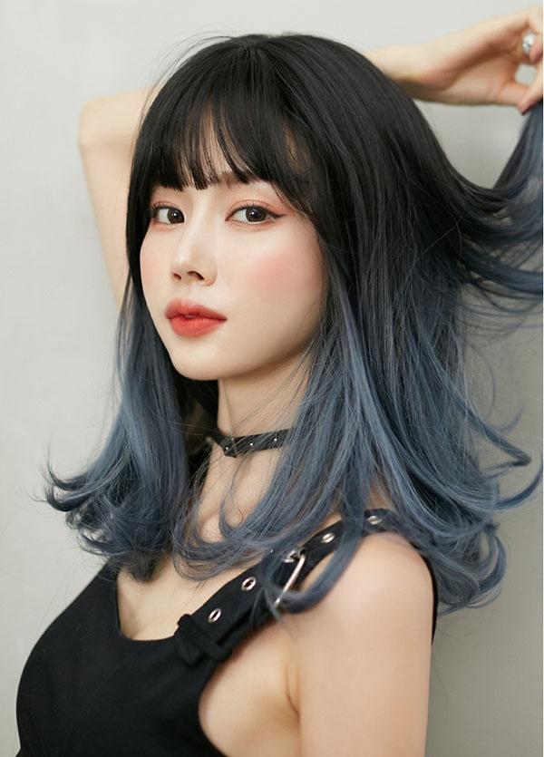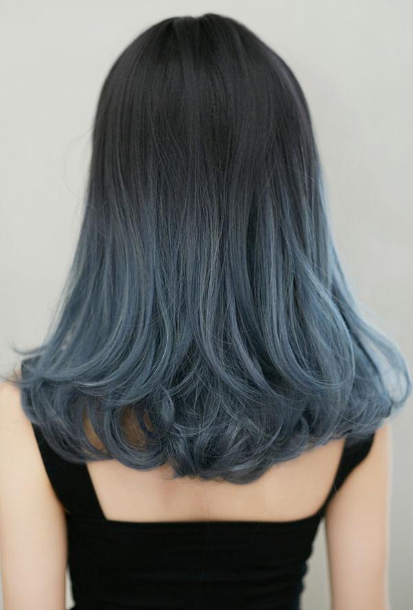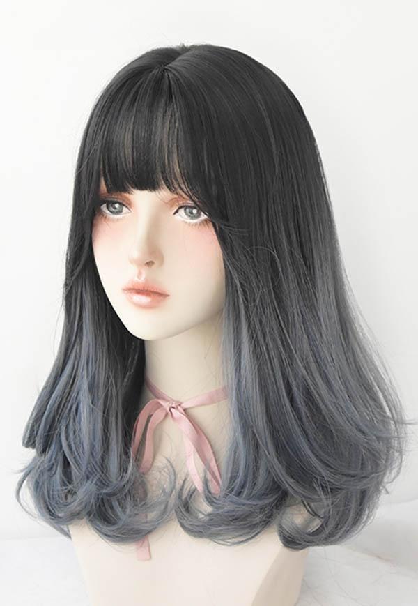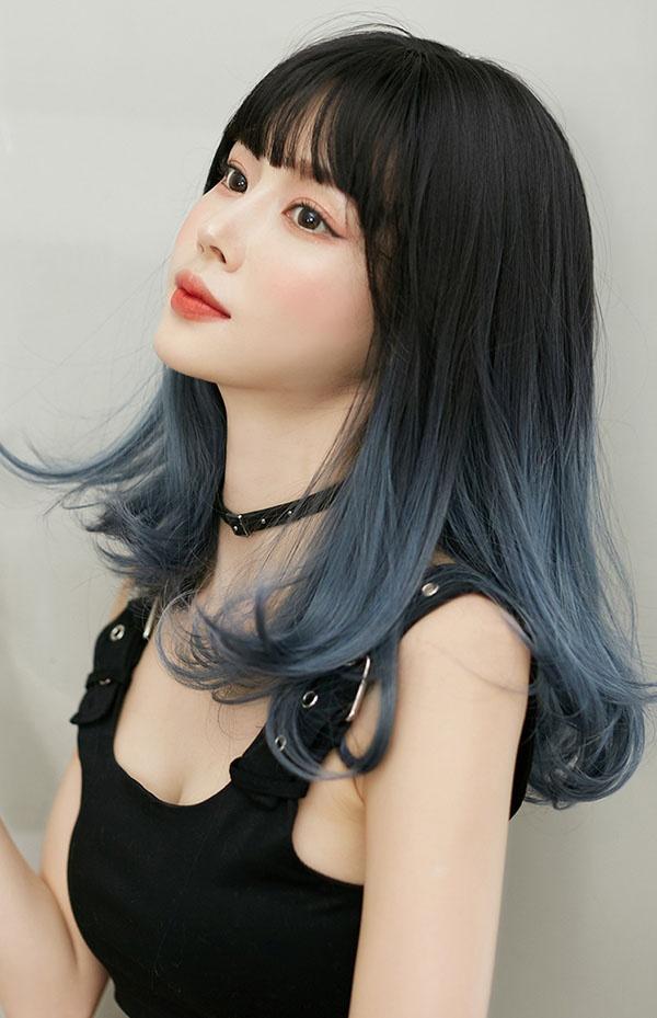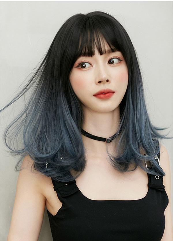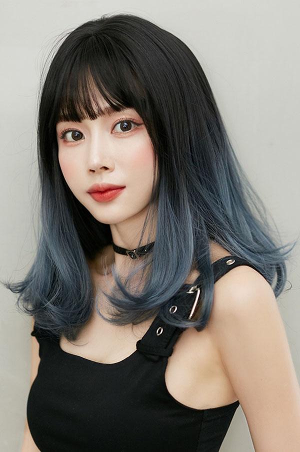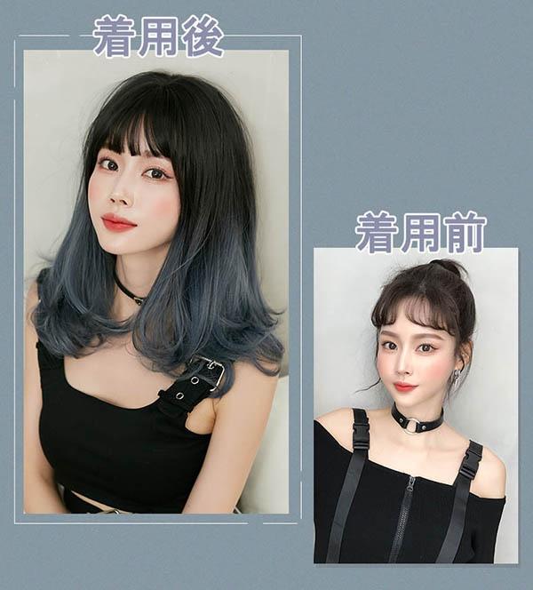 ウィッグ ミディアム 黒髪 レディース フルウィッグ スモーキーブルー セミロング かわいい 超自然 普段使い 透けバング シースルーバング エクステ グラデーション かつら wig ロング コスプレ ハロウィン レイヤー 小顔効果抜群 原宿 耐熱ウィッグ dp039x1