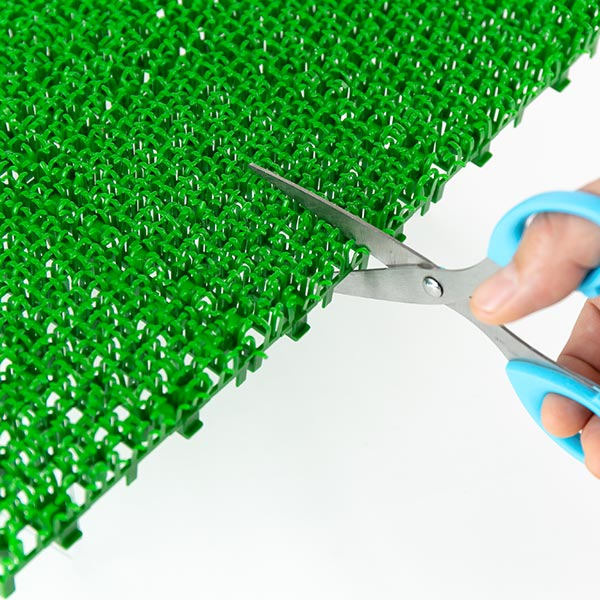 簡単施工ジョイントの方向を揃えて並べ、メス型とオス型のジョイント部分を指ではめ込むだけで簡単に設置できます。 | 設置場所に合わせてカットできるハサミやカッターで簡単に切れるので設置場所に合わせて施工できます。 |