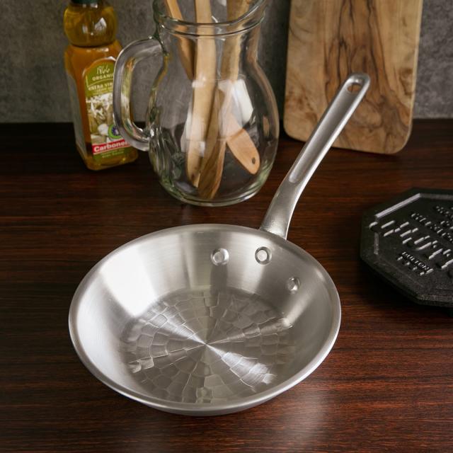 底面に打出しが施されており、強度・熱伝導共にハイクラスのアイテムです。プロユースの丈夫なフライパンなので、長くお使いいただけます。加工が施されていない分、ダイレクトに熱が伝わり、手早く調理できます。