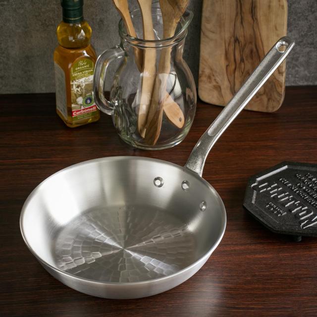 底面に打出しが施されており、強度・熱伝導共にハイクラスのアイテムです。プロユースの丈夫なフライパンなので、長くお使いいただけます。加工が施されていない分、ダイレクトに熱が伝わり、手早く調理できます。