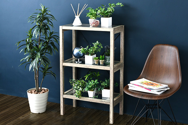 古木の味わい深い風合いと抜け感のあるガラスの棚板が、お部屋全体をすっきりとした印象に仕上げます。圧迫感の無いシンプルなデザインはお気に入りのグリーンを際立たせます。