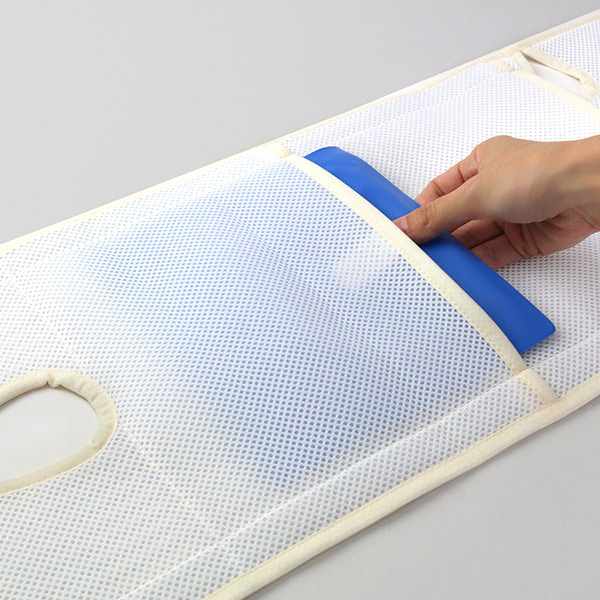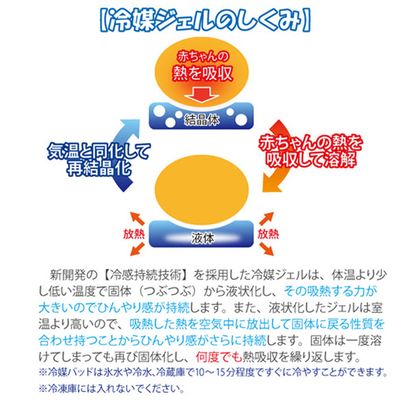 付属の冷媒ジェルは体温より少し低い温度で固体(つぶつぶ)から液状化し、その吸熱する力がひんやり感を持続させます。ぬるくなった冷媒ジェルは冷水、冷蔵庫ですぐに冷やすことができて便利です。また凍らせないので、溶けた結露が衣服などを濡らさないのもうれしいポイントです。