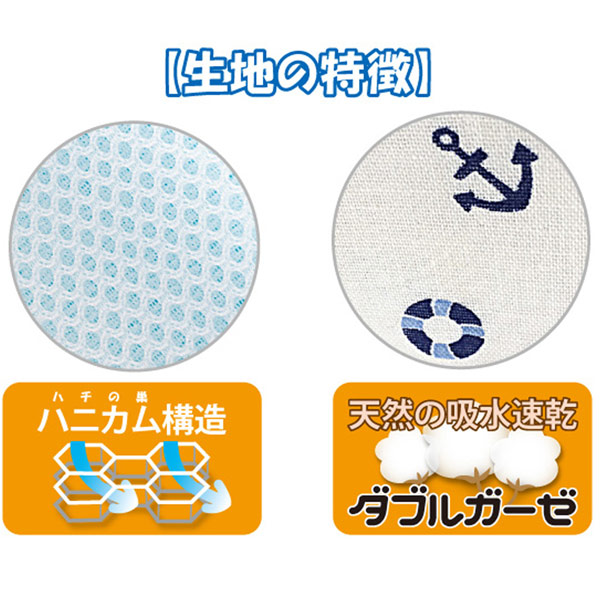 表面は肌触りが良く、吸水速乾効果のあるダブルガーゼ、裏面には通気性の良いハニカム素材を使用しています。