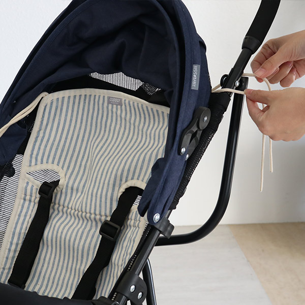紐で取付、あらゆるベビーカーに対応