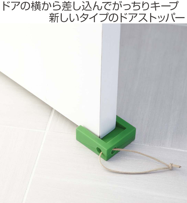 ドアの横から差し込んで使う新しいタイプのドアストッパーです。左右挟み込み式なので、ドアをがっちりキープし、風の向きが変わったりぶつかったりしてドアが閉まるのを防ぎます。