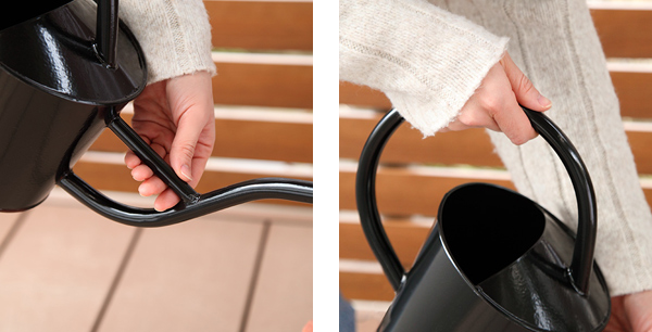 持ち手が大きく、手を添えやすい形状のため、水を満タンに入れた重量のある時でもコントロールしやすく、水やりが安定して扱いやすいです。