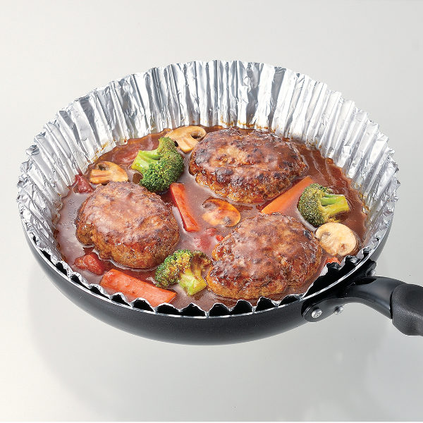 フライパン調理に使用することができるアルミニウム箔製のクッキングシートです。少量の油でヘルシーな料理ができあがります。