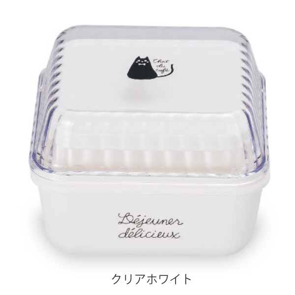 クリアな蓋に黒猫がプリントされた正方形の二段弁当箱です。蓋にはシリコンパッキンが付いているので汁漏れしにくく持ち運びが安心です。