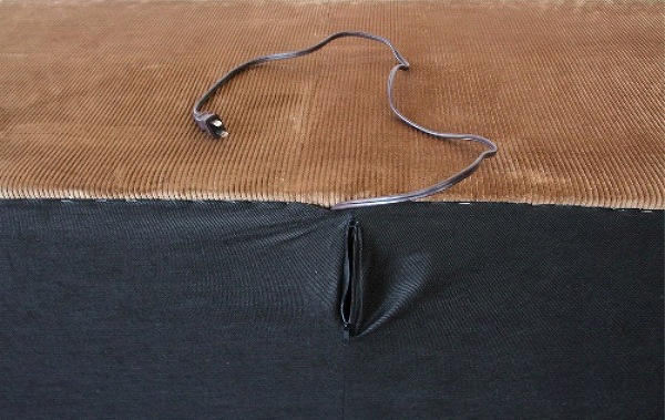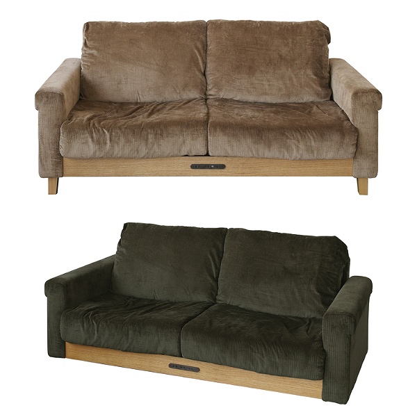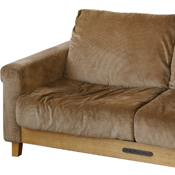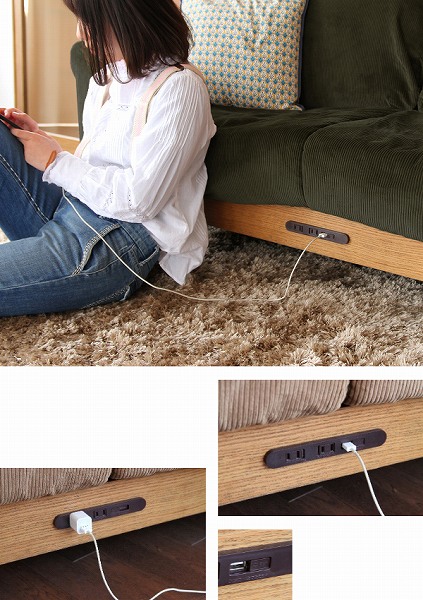 フレーム中央付近には、コンセント2口とUSB1口が内蔵されています。ケータイなどの充電はもちろん、パソコンをつないでソファに座りながら作業ができるのでとっても便利です。USBには、ほこりを防止するカバーが付いているので安心してお使いいただけます。