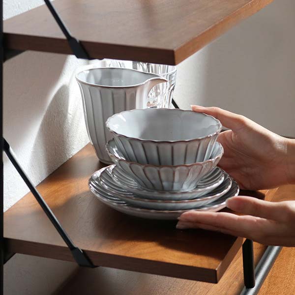 器の表面を削って凹凸をつける技法を 「しのぎ」と言います。しのぎをすることで、釉薬の濃淡がストライプに出るのが味わい深く、盛り付けた料理を引き立てます。また、結婚式や銀婚式などのお祝い事や敬老の日の贈り物におすすめです。