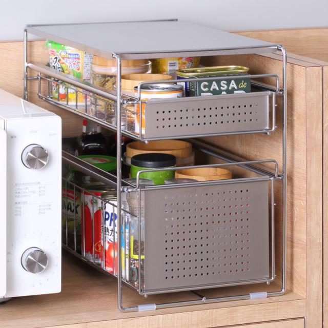 調味料や食品ストックなどで散らかりがちなシンク下をすっきり収納できるスライドラックです。抜群の収納力で細々とした調味料などがたっぷり入れられます。シンクの下を占領していた調味料を整理することで、新たな収納スペースを確保することができます。