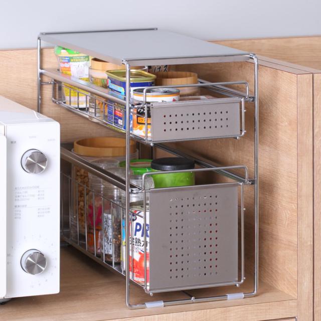 調味料や食品ストックなどで散らかりがちなシンク下をすっきり収納できるスライドラックです。抜群の収納力で細々とした調味料などがたっぷり入れられます。シンクの下を占領していた調味料を整理することで、新たな収納スペースを確保することができます。