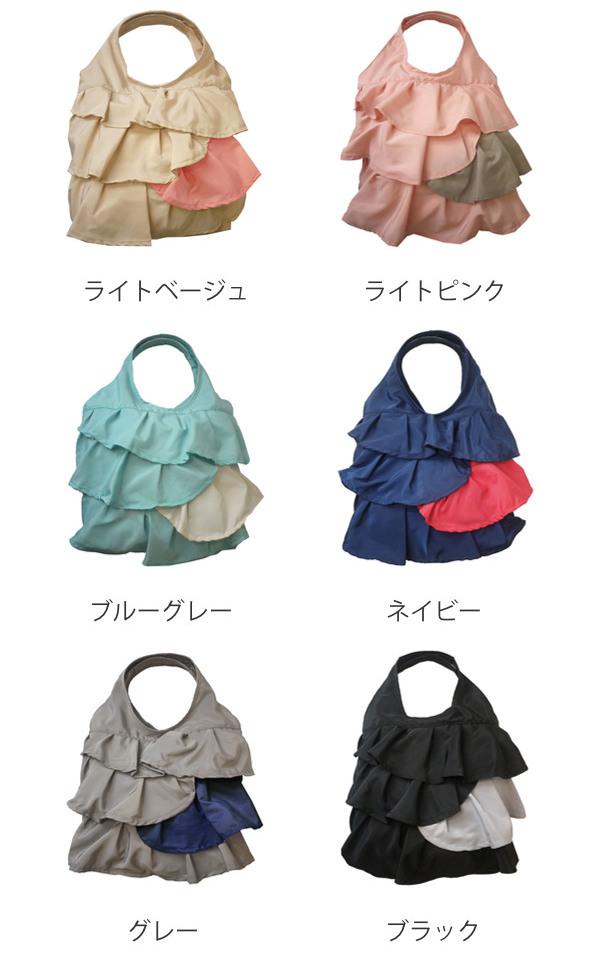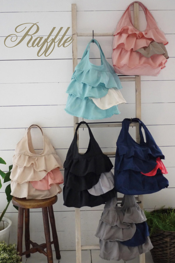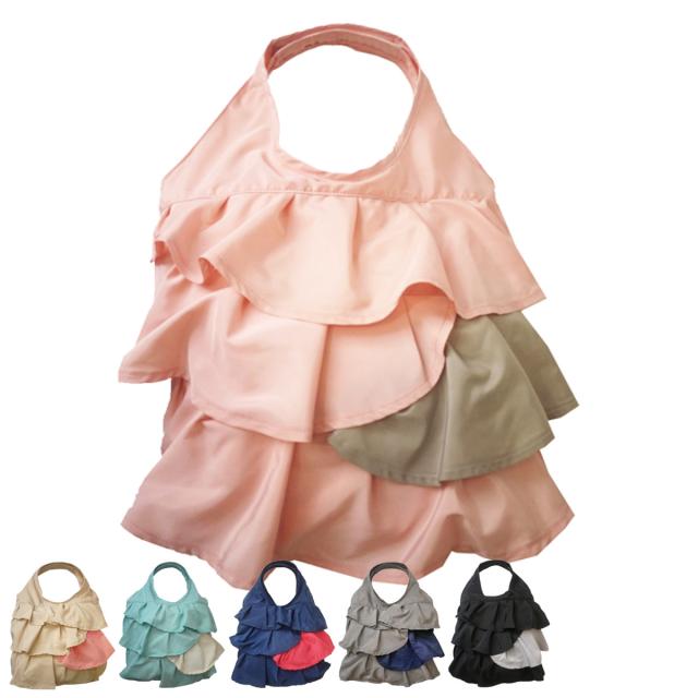 ひらひらとしたラッフルデザインが特徴的で、持っているだけでファッションのアクセントになるバッグです。カラーは6色展開で、ガーリー系からシック系のカラーまでお好きなカラーをお選び頂けます。かわいいデザインのバッグでいつものお買い物も楽しむことができます♪