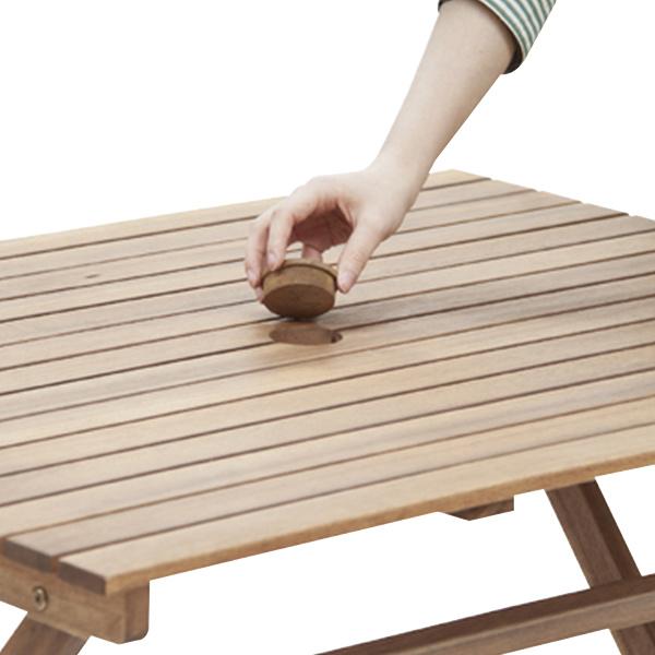 テーブルの中央にパラソルを挿せる穴(直径約4cm)が空いています。日陰を作ったり、雨をしのいだりアウトドアライフをより快適にサポートします。使わない時はフタをしてフラットな天板になります。