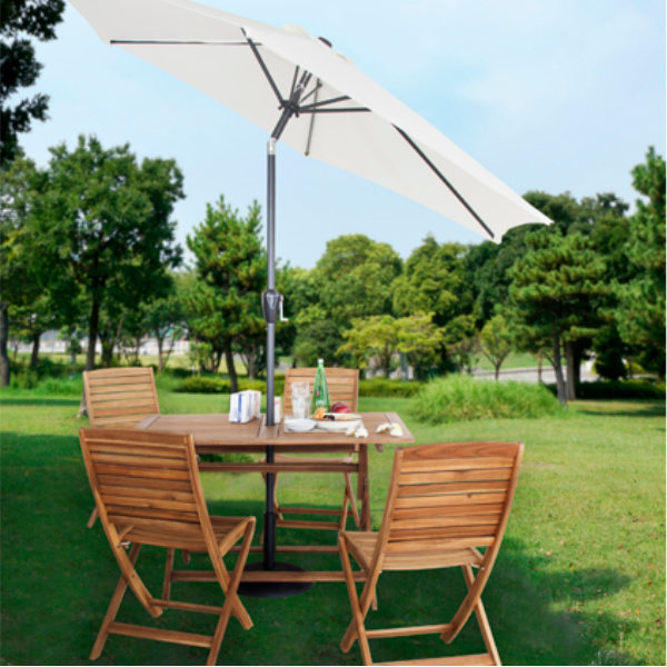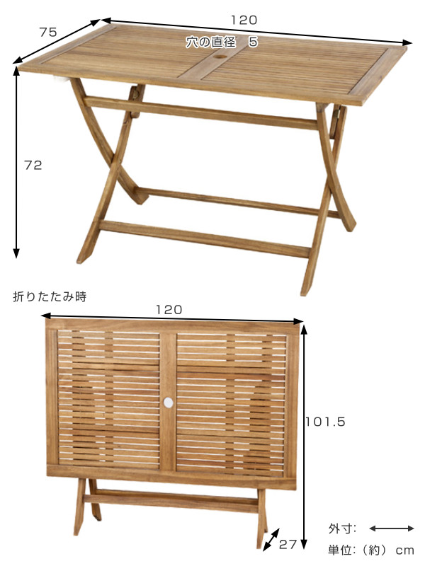 折りたたみ式簡単に折りたたみができて、悪天候時や使わない季節などは収納しておけます。 | パラソルが設置可能テーブルの中央にはパラソルを設置するための穴があります。 ※本品に椅子、パラソルは含まれていません。 |