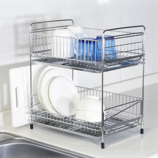 下段だけにトレーが付いている水切りラックが多いのですが、それだと上段に置いた食器の水で下に置いた食器がさらに濡れてしまいます。この商品は、上段・下段どちらにも水受けのトレーが付いているので、下段に置いた食器に上段からの水が掛かりません。食器をおいたままでもトレーは引き出すことができるので、水が溜まってしまった時も安心です。ラックの奥にトレー用のストッパーが付いているので、トレーが奥から滑り落ちる心配もありません。