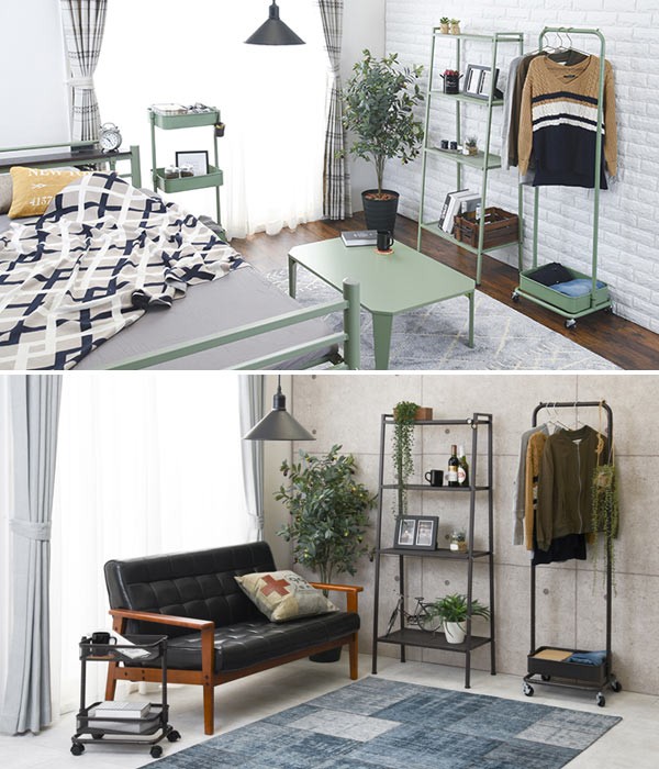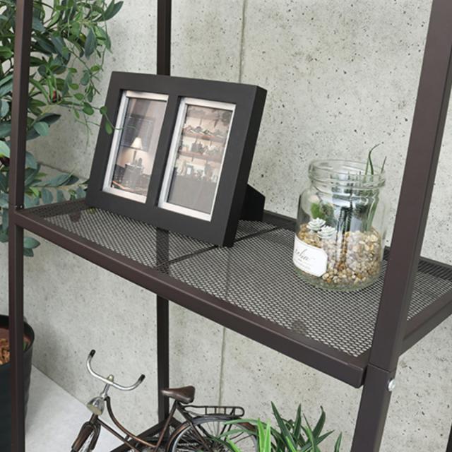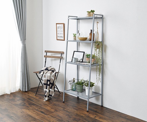細いスチールのスタイリッシュなデザインが、お気に入りの小物を際立たせてくれます。ワイドボトムなデザインなので圧迫感がなく、お部屋の空間を広く見せてくれるのも嬉しいポイントです。