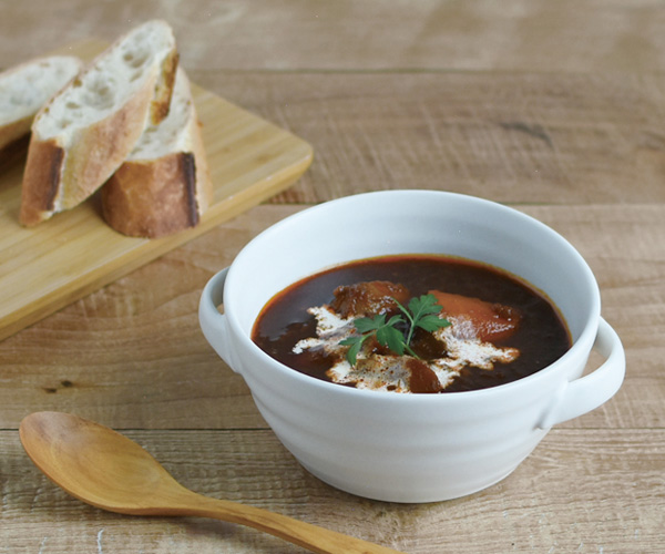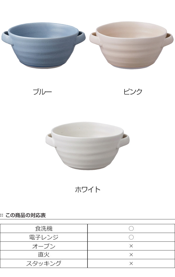 一つ一つ職人の手仕事によるゆらぎのあるフォルムは、食材を一層美味しく引き立てます。器のフチは口あたりがよく、ハンドル付きなので持ち運びにも便利です。食洗機・電子レンジ対応なので調理やお手入れも簡単です。