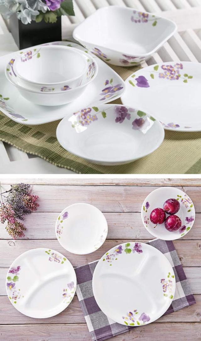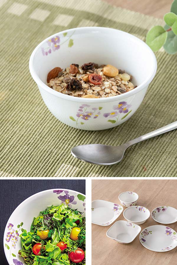 1970年アメリカで誕生したコレールは、世界初の欠け・破損に耐性がある全面積層強化ガラスの食器として、50か国以上のご家庭で愛用されているブランドです。「バイオレットミスト」シリーズは、まるで水彩画のような紫のスミレ柄。主張しすぎずお料理をより一層引き立てます。