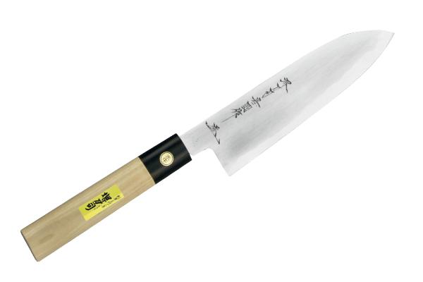 戦後日本で考案され、魚、肉、野菜の3つに使えることから、三徳という名前になりました。刃元の形は野菜を切りやすい直線、刃先の形は肉を切りやすいカーブ状、切先は魚や肉を捌きやすいとがった形をしているので、一本でいろんな食材を切ることができる便利に使える包丁です。