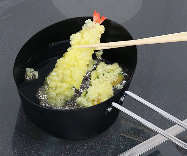 横長の形の天ぷら鍋はえび天のようなちょっと長いものを揚げるのにも便利です。深さもあるので少量の油で揚げ物がカラっと揚がります。