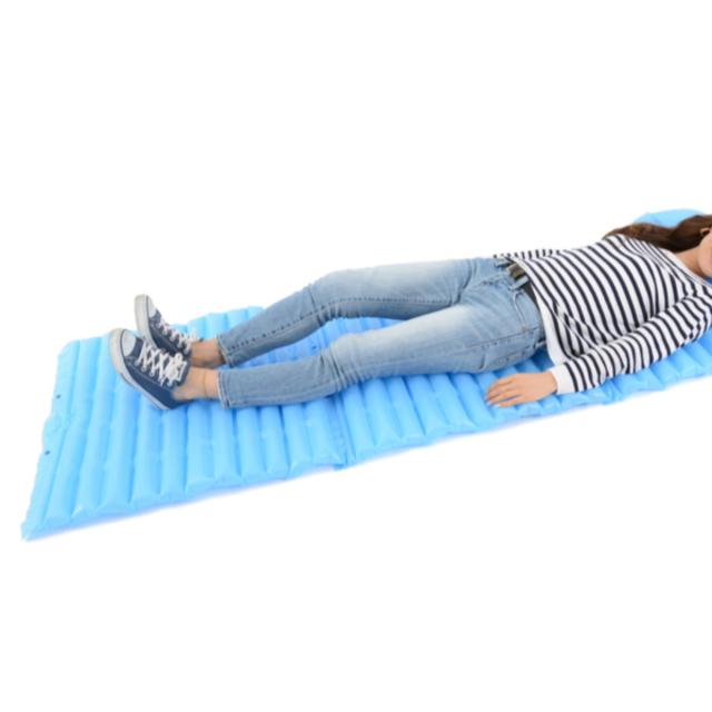 緊急災害時には布団で寝られるとは限りません。エアざぶとんはクッション性、冷たさの緩和、痛み・しびれ防止、局部への圧迫防止などに役立ちます。体育館など避難所での固く寝にくい寝床での抵抗力の低下やストレスを減らします。