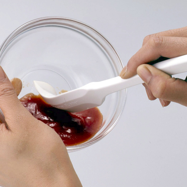 やわらかいシリコン素材なので瓶やボールのふちにフィットし、食材をきれいに取り出すのに便利です。