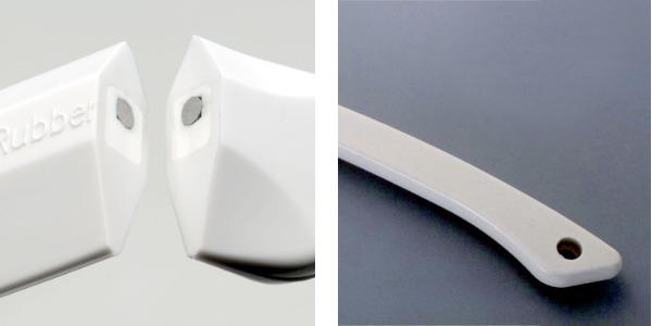 | 鉄芯材入り 芯材にはステンレスと66ナイロンを使用しているので、やわらかすぎず程良い弾力があります。 | フック穴付き 持ち手の先にはフック穴が付いているので手の届きやすい場所にかけてしまっておくことができます。 |