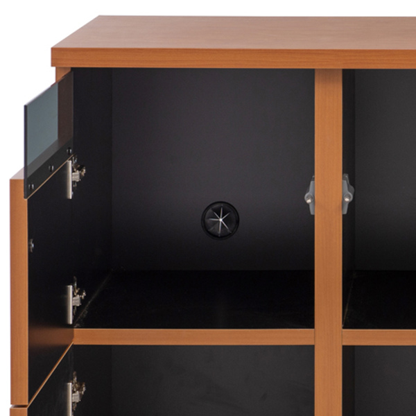 こだわりのあるデザイン木製の扉と一体になったガラス部分は、脚のデザインと合わせた、ブラック調のスモークガラスを使用しています。天板と前板には強化プリント紙を使用しているので、傷に強くなっています。 | 便利な配線穴付き棚奥には配線穴が付いているので、ルーターや充電器の配線をスッキリと収納することができます。 |