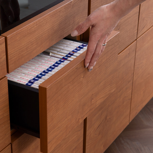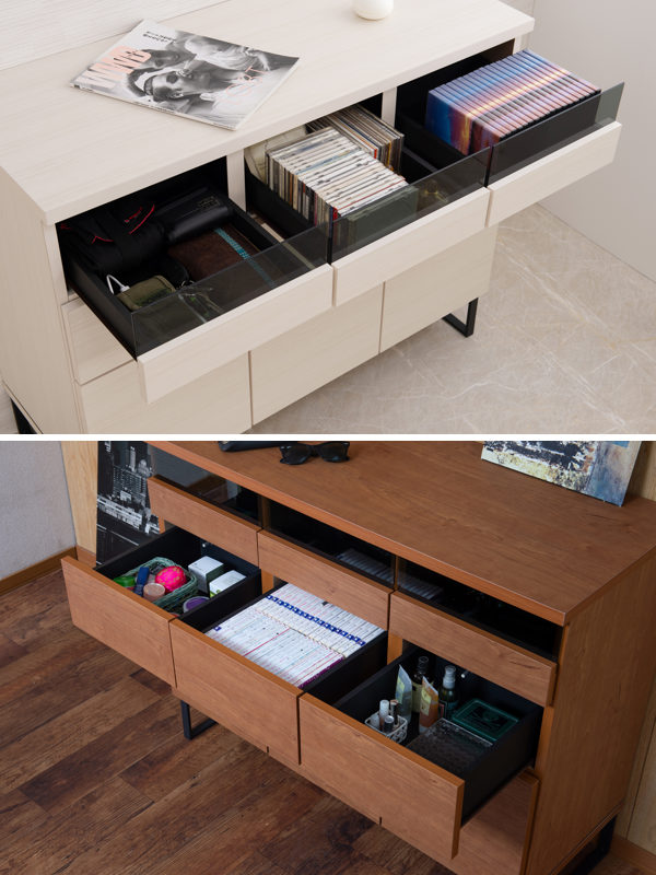 引き出しにはレールが付いているので、出し入れがスムーズに行えます。リビングの散らかりがちな小物や化粧品、DVDやCDなどを収納していただくのにオススメです。