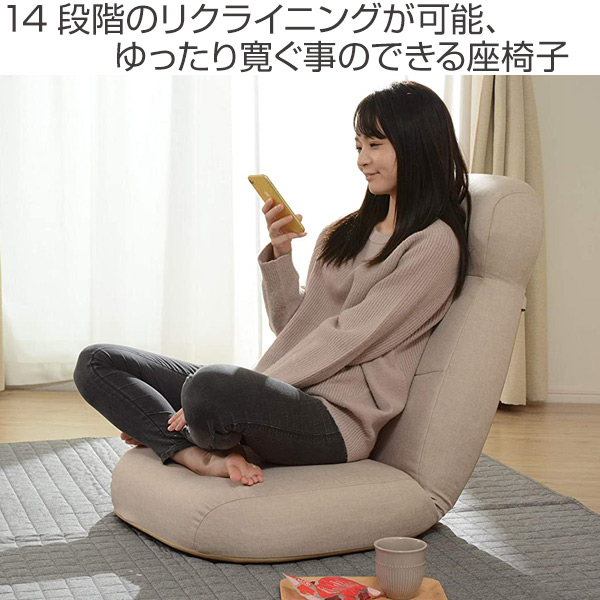 背もたれ部分の14段階リクライニングが可能な座椅子は、お好みのリラックスポジションで寛ぐ事ができます。読書をしながら、スマホやTVを見ながらゆっくり一休みする事ができます。