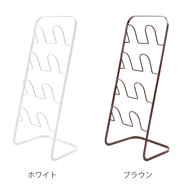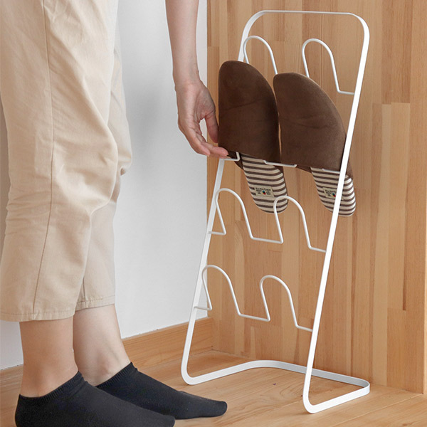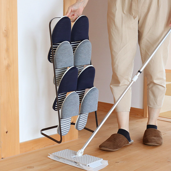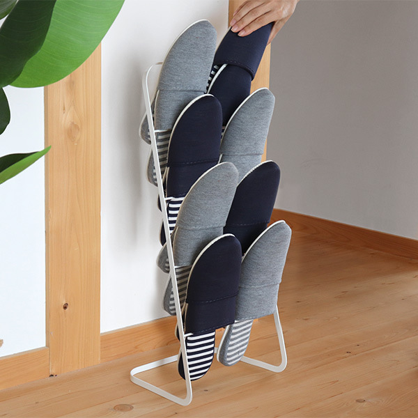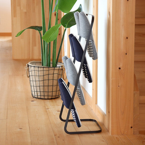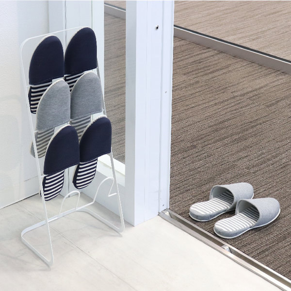 斜めに立ち上がるシルエットなので空間を圧迫せず、玄関周りをすっきりと見せることができます。スリッパは通常4足収納できますが、1足を重ねて使えば最大8足まで収納可能です。来客用スリッパの収納にもおすすめです。