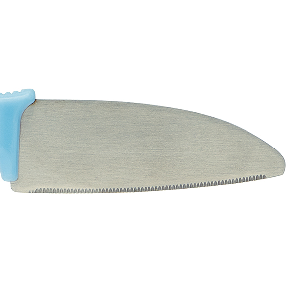 ギザギザ刃加工で触れただけでは手を切りにくいです。刃先とあごは丸くなっているのでケガをしにくい安全設計です。