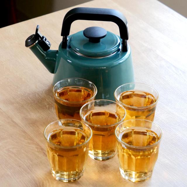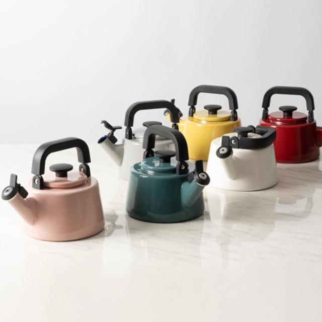 笛吹きのホーロー製ケトルです。ホーローは熱効率がいいのでお湯が沸くのも早く、保温性に優れています。丈夫で長くお使いいただけるのも嬉しいポイントです。お茶やコーヒーを淹れるには、何と言っても金気を出さないホーロー製ケトルが一番です。