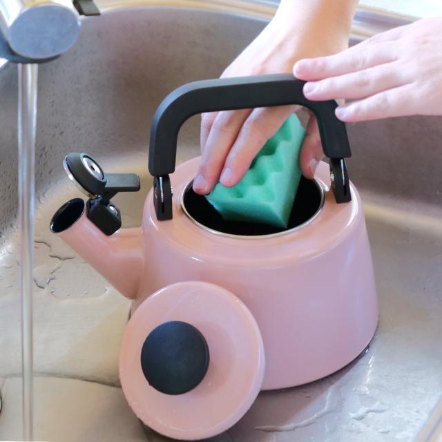 ケトルの中まで手を入れて洗えるので、しっかりと洗えます。ホーローは表面がガラス質なので、臭いや汚れがつきにくいのが特徴です。また、内面にも酸やアルカリに強い耐水性釉薬で加工が施されています。