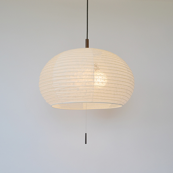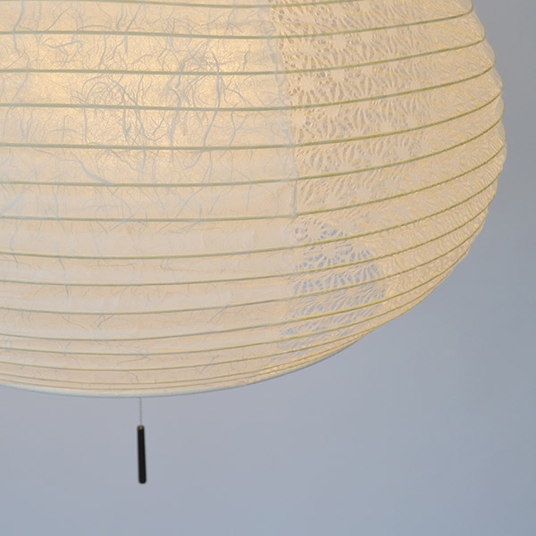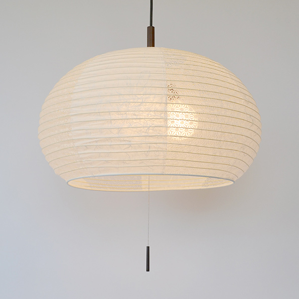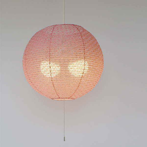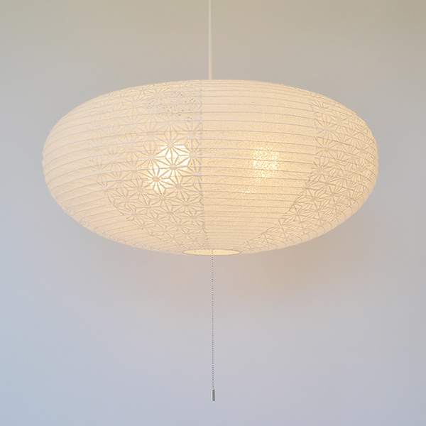存在感がある幅50cmのペンダントランプです。繊維を紙に漉きこんで雲のようにみせた雲龍紙と縁起の良い麻葉模様の透かし和紙の組み合わせが上品です。和紙を通して伝わるやわらかな灯りは、空間に明るさだけでなく癒やしも与えてくれます。