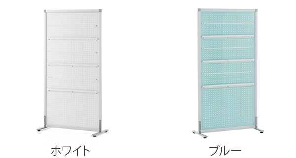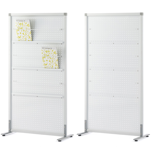掲示板やパンフレットスタンドの役割も併せ持つシンプルスクリーンです。パンチング穴タイプのパネルなので、適度に視界を遮り、閉塞感なく空間を間仕切ることができます。